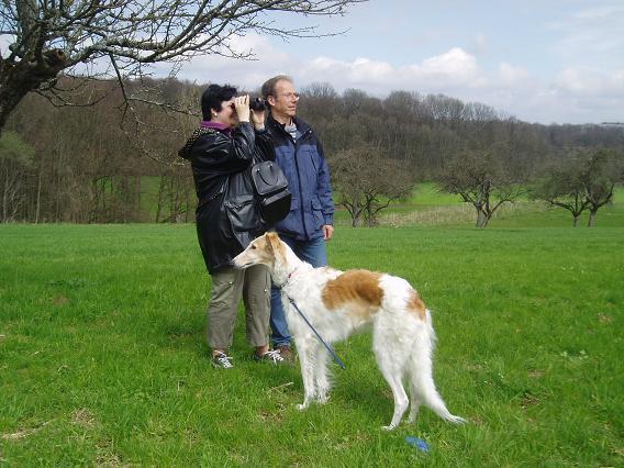 Ich nahm sofort das Telefon, rief Freunde und Bekannte im Raum Stuttgart und Göppingen an. Danach setzte mich an den Computer und suchte mir alle möglichen Daten, Telefonnummern und sonstige, hilfreich erscheinende Informationen heraus. Auch setzte ich mich sofort mit TASSO in Verbindung, um Zvoja dort in die Vermisstenliste aufnehmen zu lassen. Veröffentlichungen in allen Barsoilisten, Barsoifreunde, Barsoi.Net und European-Borzoi mit der Bitte, die Nachricht von Zvoja’s Verschwinden zu verbreiten, sollten ebenfalls helfen. Dann begann eine nicht enden wollende Zeit für uns alle. Immer wieder Anrufe aus Göppingen – nichts Neues. Niemand hatte sie gesehen. Zeitungsinserate, Suchplakate, Suchaktionen von Familie Strauss – alles ohne Erfolg. Die zugeschneiten Wege, dann später Regen und Matsch, machten die Suche nicht einfacher. Nach etwa einer Woche wurde Zvoja immer öfter in Schlat, ca. 10 km von Göppingen entfernt, gesehen. Häufig am Ortsrand, am Waldsaum und meist gegen Abend. Doch alle Versuche von Polizei, Hundebesitzern und anderen Helfern, sie einzufangen waren vergebens. Sie rannte sofort weg. Noch einmal verschickte ich E-mails an Bürger in der betroffenen Region, diverse Organisationen und Einrichtungen wie Reitställe, Flugplätze, Tierschutz- und Wandervereine etc. mit der Bitte um Unterstützung. Wieder wurden Suchplakate aufgehängt, noch mal Zeitungsinserate geschaltet und Einwohner in Schlat auf Zvoja angesprochen. Langsam zeigte die Aktion erste Erfolge. Es gingen immer öfter Anrufe aufmerksamer Bürger bei uns ein, die sie gesehen hatten. Wir trugen die Punkte, an denen Zvoja gesehen worden war in einer Umgebungskarte ein, und konnten so ein „Bewegungsprofil“ von ihr erstellen. Unsere Schweizer Freunde Ernst und Emmi Schorro halfen uns mit Ideen und vermittelten uns u.a. zu Frau Peruzzi, die mit ihren Barsois Mantrail macht – doch leider eben nur auf Menschen, wie auch ein Bloodhound Club in der Schweiz. Wir erhielten wertvolle Tipps von ihr und auch von einer anderen Schweizerin mit einem Otterhund als Spürhund. Um für alle Fälle gerüstet zu sein hatte ich in der Zwischenzeit 2 Männer mit Betäubungsgewehren und einem Betäubungsblasrohr organisiert. Um diese Waffen sinnvoll einsetzen zu können, mussten wir sicher sein, dass sich Zvoja zu bestimmten Zeiten an bestimmten Plätzen aufhält. Immer wieder gab es 2-3 Tage an denen niemand sie gesehen hatte. Da sie mit ihren neuen Besitzern noch kein Vertrauensverhältnis aufbauen konnte, überlegte ich nach Schlat zu fahren, um sie selbst zu suchen. Ihr Bewegungsprofil war jedoch noch zu unklar. Sie war nun schon mehr als 2 Wochen allein in der Wildnis – unsere arme kleine Zvoja. Ich machte mir große Sorgen, Ist sie evtl. verletzt? Ob sie wohl etwas zu Fressen fand? Gab es ausreichend Wasser für sie? Was, wenn sich ihre Leine im Unterholz verfängt? Dies wäre ihr sicheres Todesurteil, dann gäbe es für sie keine Chance mehr. In der Woche nach Ostern stand dann mein Entschluss fest. Ich fliege nach Stuttgart! Bekannte boten an, mich abzuholen und sich an der Suche zu beteiligen. Nun hieß es, hier alles zu organisieren – meine Freundin Brigitte Döring (Barsois vom Tollhaus) zu bitten, bei uns einzuhüten (da gerade Ferien waren, konnten ihr Mann und ihre Kinder ihre Barsois versorgen), wichtige Dinge noch schnell erledigen, Utensilien die zum Suchen hilfreich sein könnten suchen oder noch besorgen etc. Alles war bereit, Tickets gekauft, Tasche gepackt, Hotel gebucht, Flug und Abholung waren organisiert. Dann besprach ich noch einmal alles mit Brigitte und uns kam eine noch bessere Idee. Wir beschlossen, gemeinsam mit dem Auto zu fahren und ihren Bloodhound Hubert mitzunehmen. Falls wir Zvoja nicht selber sehen, könnten wir mit seiner Hilfe aber ihre Spur aufnehmen. Die Voraussetzungen waren gut. Der Wetterbericht sagte einige sonnige Tage vorher. Bei Regenwetter hätte Hubert Schwierigkeiten gehabt, ihre Spur zu verfolgen. Bloodhounds werden überwiegend in den USA erfolgreich als Spürhunde eingesetzt. Sie suchen mit einer enormen Präzision – jedoch etwas anders als die üblichen hier bekannten Spürhunde (mehr dazu kann Ihnen Frau Döring beantworten). Hubert ist knapp 3 Jahre alt und absolviert seine Ausbildung in Holland. Einmal im Monat wird dort trainiert. In Schlat sollte es Huberts erster scharfer Einsatz werden. Unser Plan stand fest. Nun musste nur noch jemand zum Einhüten kommen. Ich rief meine Freundin Ingrid Lorenz, von Baltrum an, die spontan zusagte und gemeinsam mit Brigittes Tochter Anna hier bei uns alle Hunde versorgte. So fuhren Brigitte, Hubert und ich am Donnerstag gegen 07:30 los gen Süden. Alles lief reibungslos, die Autobahn war frei, und so waren wir bereits kurz vor 14 Uhr in unsrem Hotel in Schlat. Dort trafen wir uns mit dem in der Zwischenzeit von Petra Etzel organisierten „Zvoja-Such-Team“. Petra Etzel, Eigentümerin von Zvojas Schwester Ibuschka, hatte 2 Freundinnen mitsamt Kindern mitgebracht und Herr Strauss war auch zur Stelle. Nach einem ersten Suchplan und einer kleinen Stärkung machten wir uns auf den Weg, dorthin, wo Zvoja 2 Tage zuvor gesehen wurde. Wir durften uns im Hotel „zum Lamm“ in Schlat netterweise Umgebungskarten kopieren – diese hatte jeder von uns und so konnten wir genau einteilen, welches Team in welchem Abschnitt suchte. Jedes Team war ausgerüstet mit Handy, Karte, Taschenlampe und Fernglas – so konnten wir uns untereinander immer verständigen und auch zeitweise sehen. Bedingt durch die günstige Topographie, teilten wir unsere Suche so auf, dass ein Team die Hügel von oben einsehen konnte, ein Team von rechts, ein Team von links und ein Team von unten. Die Arbeitsteilung im Team wurde nun an das Gelände angepasst. Einer lief, einer fuhr mit dem Auto die Gegend ab. Wir verteilten noch einmal unsere Handynummern im Ort und baten die Schlater um noch mehr Aufmerksamkeit. |